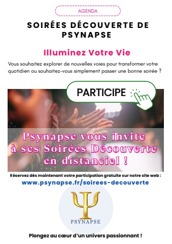 AGENDASOIR%u00c9 ES D %u00c9COU V ERTE D EPSYNAPSEIlluminez Votre VieR%u00e9servez d%u00e8s maintenant votre participation gratuite sur notre site web :www.psynapse.fr/soirees-decouvertePlongez au c%u0153ur d%u2019un univers passionnant !Vous souhaitez explorer de nouvelles voies pour transformer votrequotidien ou souhaitez-vous simplement passer une bonne soir%u00e9e ?Psynapse vous invite%u00e0 ses Soi r%u00e9es D%u00e9couver teen distanciel !Psynapse vous invite%u00e0 ses Soi r%u00e9es D%u00e9couver teen distanciel !PPAARRTTIICCIIPPEE