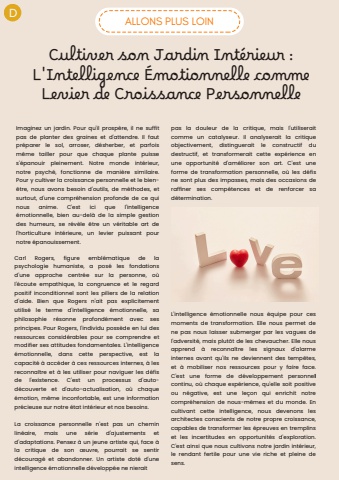 ALLONS PLUS LOINDCultiver son Jardin Int%u00e9rieur :L'Intelligence %u00c9motionnelle commeLevier de Croissance PersonnelleImaginez un jardin. Pour qu'il prosp%u00e8re, il ne suffitpas de planter des graines et d'attendre. Il fautpr%u00e9parer le sol, arroser, d%u00e9sherber, et parfoism%u00eame tailler pour que chaque plante puisses'%u00e9panouir pleinement. Notre monde int%u00e9rieur,notre psych%u00e9, fonctionne de mani%u00e8re similaire.Pour y cultiver la croissance personnelle et le bien%u00eatre, nous avons besoin d'outils, de m%u00e9thodes, etsurtout, d'une compr%u00e9hension profonde de ce quinous anime. C'est ici que l'intelligence%u00e9motionnelle, bien au-del%u00e0 de la simple gestiondes humeurs, se r%u00e9v%u00e8le %u00eatre un v%u00e9ritable art del'horticulture int%u00e9rieure, un levier puissant pournotre %u00e9panouissement.pas la douleur de la critique, mais l'utiliseraitcomme un catalyseur. Il analyserait la critiqueobjectivement, distinguerait le constructif dudestructif, et transformerait cette exp%u00e9rience enune opportunit%u00e9 d'am%u00e9liorer son art. C'est uneforme de transformation personnelle, o%u00f9 les d%u00e9fisne sont plus des impasses, mais des occasions deraffiner ses comp%u00e9tences et de renforcer sad%u00e9termination.Carl Rogers, figure embl%u00e9matique de lapsychologie humaniste, a pos%u00e9 les fondationsd'une approche centr%u00e9e sur la personne, o%u00f9l'%u00e9coute empathique, la congruence et le regardpositif inconditionnel sont les piliers de la relationd'aide. Bien que Rogers n'ait pas explicitementutilis%u00e9 le terme d'intelligence %u00e9motionnelle, saphilosophie r%u00e9sonne profond%u00e9ment avec sesprincipes. Pour Rogers, l'individu poss%u00e8de en lui desressources consid%u00e9rables pour se comprendre etmodifier ses attitudes fondamentales. L'intelligence%u00e9motionnelle, dans cette perspective, est lacapacit%u00e9 %u00e0 acc%u00e9der %u00e0 ces ressources internes, %u00e0 lesreconna%u00eetre et %u00e0 les utiliser pour naviguer les d%u00e9fisde l'existence. C'est un processus d'autod%u00e9couverte et d'auto-actualisation, o%u00f9 chaque%u00e9motion, m%u00eame inconfortable, est une informationpr%u00e9cieuse sur notre %u00e9tat int%u00e9rieur et nos besoins.La croissance personnelle n'est pas un cheminlin%u00e9aire, mais une s%u00e9rie d'ajustements etd'adaptations. Pensez %u00e0 un jeune artiste qui, face %u00e0la critique de son %u0153uvre, pourrait se sentird%u00e9courag%u00e9 et abandonner. Un artiste dot%u00e9 d'uneintelligence %u00e9motionnelle d%u00e9velopp%u00e9e ne nieraitL'intelligence %u00e9motionnelle nous %u00e9quipe pour cesmoments de transformation. Elle nous permet dene pas nous laisser submerger par les vagues del'adversit%u00e9, mais plut%u00f4t de les chevaucher. Elle nousapprend %u00e0 reconna%u00eetre les signaux d'alarmeinternes avant qu'ils ne deviennent des temp%u00eates,et %u00e0 mobiliser nos ressources pour y faire face.C'est une forme de d%u00e9veloppement personnelcontinu, o%u00f9 chaque exp%u00e9rience, qu'elle soit positiveou n%u00e9gative, est une le%u00e7on qui enrichit notrecompr%u00e9hension de nous-m%u00eames et du monde. Encultivant cette intelligence, nous devenons lesarchitectes conscients de notre propre croissance,capables de transformer les %u00e9preuves en tremplinset les incertitudes en opportunit%u00e9s d'exploration.C'est ainsi que nous cultivons notre jardin int%u00e9rieur,le rendant fertile pour une vie riche et pleine desens.