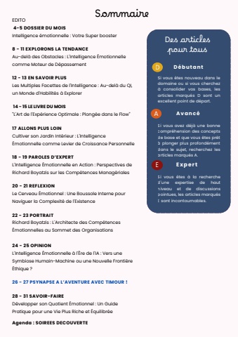 SommaireDes articlespour tousDD%u00e9butantAAvanc%u00e9EExper tSi vous %u00eates nouveau dans ledomaine ou si vous cherchez%u00e0 consolider vos bases, lesarticles marqu%u00e9s D sont unexcellent point de d%u00e9part.Si vous avez d%u00e9j%u00e0 une bonnecompr%u00e9hension des conceptsde base et que vous %u00eates pr%u00eat%u00e0 plonger plus profond%u00e9mentdans le sujet, recherchez lesarticles marqu%u00e9s A.Si vous %u00eates %u00e0 la recherched'une expertise de hautniveau et de discussionspointues, les articles marqu%u00e9sE sont incontournables.EDITO4-5 DOSSIER DU MOISIntelligence %u00e9motionnelle : Votre Super booster8 - 11 EXPLORONS LA TENDANCEAu-del%u00e0 des Obstacles : L'Intelligence %u00c9motionnellecomme Moteur de D%u00e9passement12 - 13 EN SAVOIR PLUSLes Multiples Facettes de l'Intelligence : Au-del%u00e0 du QI,un Monde d'Habilit%u00e9s %u00e0 Explorer14 - 15 LE LIVRE DU MOIS\rt de l'Exp%u00e9rience Optimale : Plong%u00e9e dans le Flow\17 ALLONS PLUS LOINCultiver son Jardin Int%u00e9rieur : L'Intelligence%u00c9motionnelle comme Levier de Croissance Personnelle18 - 19 PAROLES D%u2019EXPERTL'Intelligence %u00c9motionnelle en Action : Perspectives deRichard Boyatzis sur les Comp%u00e9tences Manag%u00e9riales20 - 21 REFLEXIONLe Cerveau %u00c9motionnel : Une Boussole Interne pourNaviguer la Complexit%u00e9 de l'Existence22 - 23 PORTRAITRichard Boyatzis : L'Architecte des Comp%u00e9tences%u00c9motionnelles au Sommet des Organisations24 - 25 OPINIONL'Intelligence %u00c9motionnelle %u00e0 l'%u00c8re de l'IA : Vers uneSymbiose Humain-Machine ou une Nouvelle Fronti%u00e8re%u00c9thique ?26 - 27 PSYNAPSE A L%u2019AVENTURE AVEC TIMOUR !28 - 31 SAVOIR-FAIRED%u00e9velopper son Quotient %u00c9motionnel : Un GuidePratique pour une Vie Plus Riche et %u00c9quilibr%u00e9eAgenda : SOIREES DECOUVERTE