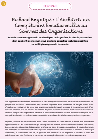 DRichard Boyatzis : L'Architecte desComp%u00e9tences %u00c9motionnelles auSommet des OrganisationsPORTRAITDans le monde exigeant du leadership et de la gestion, la simple possessiond'un quotient intellectuel %u00e9lev%u00e9 ou d'une expertise technique pointuene suffit plus %u00e0 garantir le succ%u00e8s.Les organisations modernes, confront%u00e9es %u00e0 une complexit%u00e9 croissante et %u00e0 des environnements enperp%u00e9tuelle mutation, recherchent des leaders capables non seulement de diriger, mais aussid'inspirer, de motiver et de cr%u00e9er des environnements de travail propices %u00e0 l'%u00e9panouissement. C'estdans ce contexte que les travaux de Richard Boyatzis, professeur %u00e9m%u00e9rite %u00e0 l'Universit%u00e9 Case WesternReserve, ont pris une importance capitale, le positionnant comme l'un des architectes majeurs de lacompr%u00e9hension des comp%u00e9tences %u00e9motionnelles et sociales dans le leadership et le management.Boyatzis, souvent en collaboration avec Daniel Goleman et Annie McKee, a men%u00e9 des recherchesapprofondies sur les comp%u00e9tences qui distinguent les leaders exceptionnels des autres. Ses %u00e9tudes,bas%u00e9es sur des d%u00e9cennies d'observation et d'analyse dans diverses organisations %u00e0 travers le monde,ont d%u00e9montr%u00e9 de mani%u00e8re irr%u00e9futable que les comp%u00e9tences %u00e9motionnelles et sociales %u2013 telles quel'empathie, la conscience de soi, la gestion des relations et la capacit%u00e9 %u00e0 inspirer %u2013 sont despr%u00e9dicteurs bien plus fiables de la performance manag%u00e9riale que les comp%u00e9tences purement
