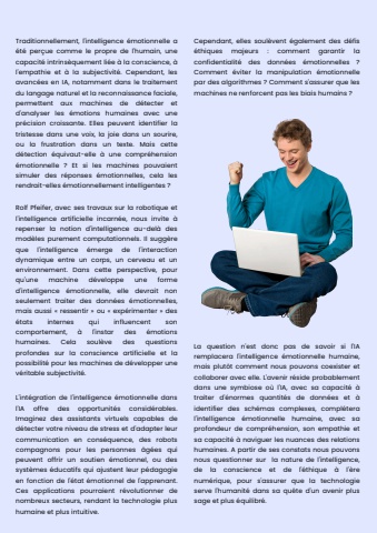 L'int%u00e9gration de l'intelligence %u00e9motionnelle dansl'IA offre des opportunit%u00e9s consid%u00e9rables.Imaginez des assistants virtuels capables ded%u00e9tecter votre niveau de stress et d'adapter leurcommunication en cons%u00e9quence, des robotscompagnons pour les personnes %u00e2g%u00e9es quipeuvent offrir un soutien %u00e9motionnel, ou dessyst%u00e8mes %u00e9ducatifs qui ajustent leur p%u00e9dagogieen fonction de l'%u00e9tat %u00e9motionnel de l'apprenant.Ces applications pourraient r%u00e9volutionner denombreux secteurs, rendant la technologie plushumaine et plus intuitive.Traditionnellement, l'intelligence %u00e9motionnelle a%u00e9t%u00e9 per%u00e7ue comme le propre de l'humain, unecapacit%u00e9 intrins%u00e8quement li%u00e9e %u00e0 la conscience, %u00e0l'empathie et %u00e0 la subjectivit%u00e9. Cependant, lesavanc%u00e9es en IA, notamment dans le traitementdu langage naturel et la reconnaissance faciale,permettent aux machines de d%u00e9tecter etd'analyser les %u00e9motions humaines avec unepr%u00e9cision croissante. Elles peuvent identifier latristesse dans une voix, la joie dans un sourire,ou la frustration dans un texte. Mais cetted%u00e9tection %u00e9quivaut-elle %u00e0 une compr%u00e9hension%u00e9motionnelle ? Et si les machines pouvaientsimuler des r%u00e9ponses %u00e9motionnelles, cela lesrendrait-elles %u00e9motionnellement intelligentes ?Rolf Pfeifer, avec ses travaux sur la robotique etl'intelligence artificielle incarn%u00e9e, nous invite %u00e0repenser la notion d'intelligence au-del%u00e0 desmod%u00e8les purement computationnels. Il sugg%u00e8reque l'intelligence %u00e9merge de l'interactiondynamique entre un corps, un cerveau et unenvironnement. Dans cette perspective, pourqu'une machine d%u00e9veloppe une formed'intelligence %u00e9motionnelle, elle devrait nonseulement traiter des donn%u00e9es %u00e9motionnelles,mais aussi %u00ab ressentir %u00bb ou %u00ab exp%u00e9rimenter %u00bb des%u00e9tats internes qui influencent soncomportement, %u00e0 l'instar des %u00e9motionshumaines. Cela soul%u00e8ve des questionsprofondes sur la conscience artificielle et lapossibilit%u00e9 pour les machines de d%u00e9velopper unev%u00e9ritable subjectivit%u00e9.Cependant, elles soul%u00e8vent %u00e9galement des d%u00e9fis%u00e9thiques majeurs : comment garantir laconfidentialit%u00e9 des donn%u00e9es %u00e9motionnelles ?Comment %u00e9viter la manipulation %u00e9motionnellepar des algorithmes ? Comment s'assurer que lesmachines ne renforcent pas les biais humains ?La question n'est donc pas de savoir si l'IAremplacera l'intelligence %u00e9motionnelle humaine,mais plut%u00f4t comment nous pouvons coexister etcollaborer avec elle. L'avenir r%u00e9side probablementdans une symbiose o%u00f9 l'IA, avec sa capacit%u00e9 %u00e0traiter d'%u00e9normes quantit%u00e9s de donn%u00e9es et %u00e0identifier des sch%u00e9mas complexes, compl%u00e9teral'intelligence %u00e9motionnelle humaine, avec saprofondeur de compr%u00e9hension, son empathie etsa capacit%u00e9 %u00e0 naviguer les nuances des relationshumaines. A partir de ses constats nous pouvonsnous questionner sur la nature de l'intelligence,de la conscience et de l'%u00e9thique %u00e0 l'%u00e8renum%u00e9rique, pour s'assurer que la technologieserve l'humanit%u00e9 dans sa qu%u00eate d'un avenir plussage et plus %u00e9quilibr%u00e9.
