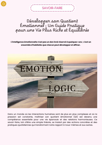 DD%u00e9velopper son Quotient%u00c9motionnel : Un Guide Pratiquepour une Vie Plus Riche et %u00c9quilibr%u00e9eSAVOIR-FAIREL'intelligence %u00e9motionnelle n'est pas un don inn%u00e9 r%u00e9serv%u00e9 %u00e0 quelques-uns ; c'est unensemble d'habilet%u00e9s que chacun peut d%u00e9velopper et affiner.Dans un monde o%u00f9 les interactions humaines sont de plus en plus complexes et o%u00f9 lapression est constante, ma%u00eetriser son quotient %u00e9motionnel (QE) est devenu unecomp%u00e9tence essentielle pour une vie %u00e9panouie et des relations harmonieuses. Cesavoir-faire, loin d'%u00eatre une simple th%u00e9orie, se traduit par des actions concr%u00e8tes et despratiques quotidiennes qui transforment notre rapport %u00e0 nous-m%u00eames et aux autres.