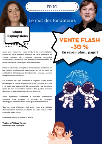 EDITOChersPsynapsiensLe mot des fondateursAlors que l'automne nous invite %u00e0 la contemplationint%u00e9rieure, nous sommes heureux de vous pr%u00e9senter ce32%u00e8me num%u00e9ro de Psynapse Hypnose Magazine,enti%u00e8rement consacr%u00e9 %u00e0 une dimension fondamentale denotre humanit%u00e9 : l'intelligence %u00e9motionnelle.Dans le labyrinthe complexe de l'existence moderne, o%u00f9les rep%u00e8res traditionnels s'estompent et o%u00f9 les d%u00e9fis semultiplient, l'intelligence %u00e9motionnelle %u00e9merge commeune boussole essentielle.Ce num%u00e9ro est une invitation %u00e0 explorer cette formed'intelligence subtile et pourtant d'une puissance inou%u00efe.Il ne s'agit pas seulement de comprendre nos %u00e9motions,mais de les reconna%u00eetre comme des guides pr%u00e9cieuxdans nos prises de d%u00e9cision et nos relations.Vous explorerez comment le cerveau %u00e9motionnelfa%u00e7onne notre rapport au monde, et commentd%u00e9velopper concr%u00e8tement votre quotient %u00e9motionnel.Que ce mois d'octobre soit pour vous une p%u00e9rioded'introspection f%u00e9conde, o%u00f9 l'%u00e9cho de votre c%u0153ur se faitentendre avec clart%u00e9.Excellente lecture %u00e0 toutes et %u00e0 tous.Virginie et Philippe VernoisFondateurs de PsynapseVENTE FLASH-30 %VENTE FLASH-30 %EEnn ssaavvooiirr pplluuss...... ppaaggee 77