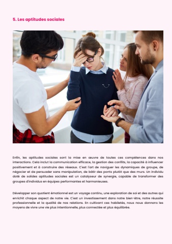 5. Les aptitudes socialesEnfin, les aptitudes sociales sont la mise en %u0153uvre de toutes ces comp%u00e9tences dans nosinteractions. Cela inclut la communication efficace, la gestion des conflits, la capacit%u00e9 %u00e0 influencerpositivement et %u00e0 construire des r%u00e9seaux. C'est l'art de naviguer les dynamiques de groupe, den%u00e9gocier et de persuader sans manipulation, de b%u00e2tir des ponts plut%u00f4t que des murs. Un individudot%u00e9 de solides aptitudes sociales est un catalyseur de synergie, capable de transformer desgroupes d'individus en %u00e9quipes performantes et harmonieuses.D%u00e9velopper son quotient %u00e9motionnel est un voyage continu, une exploration de soi et des autres quienrichit chaque aspect de notre vie. C'est un investissement dans notre bien-%u00eatre, notre r%u00e9ussiteprofessionnelle et la qualit%u00e9 de nos relations. En cultivant ces habilet%u00e9s, nous nous donnons lesmoyens de vivre une vie plus intentionnelle, plus connect%u00e9e et plus %u00e9quilibr%u00e9e.
