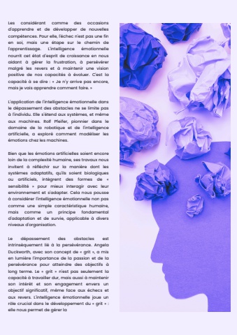 L'application de l'intelligence %u00e9motionnelle dansle d%u00e9passement des obstacles ne se limite pas%u00e0 l'individu. Elle s'%u00e9tend aux syst%u00e8mes, et m%u00eameaux machines. Rolf Pfeifer, pionnier dans ledomaine de la robotique et de l'intelligenceartificielle, a explor%u00e9 comment mod%u00e9liser les%u00e9motions chez les machines.Bien que les %u00e9motions artificielles soient encoreloin de la complexit%u00e9 humaine, ses travaux nousinvitent %u00e0 r%u00e9fl%u00e9chir sur la mani%u00e8re dont lessyst%u00e8mes adaptatifs, qu'ils soient biologiquesou artificiels, int%u00e8grent des formes de %u00absensibilit%u00e9 %u00bb pour mieux interagir avec leurenvironnement et s'adapter. Cela nous pousse%u00e0 consid%u00e9rer l'intelligence %u00e9motionnelle non pascomme une simple caract%u00e9ristique humaine,mais comme un principe fondamentald'adaptation et de survie, applicable %u00e0 diversniveaux d'organisation.Les consid%u00e9rant comme des occasionsd'apprendre et de d%u00e9velopper de nouvellescomp%u00e9tences. Pour elle, l'%u00e9chec n'est pas une finen soi, mais une %u00e9tape sur le chemin del'apprentissage. L'intelligence %u00e9motionnellenourrit cet %u00e9tat d'esprit de croissance en nousaidant %u00e0 g%u00e9rer la frustration, %u00e0 pers%u00e9v%u00e9rermalgr%u00e9 les revers et %u00e0 maintenir une visionpositive de nos capacit%u00e9s %u00e0 %u00e9voluer. C'est lacapacit%u00e9 %u00e0 se dire : %u00ab Je n'y arrive pas encore,mais je vais apprendre comment faire. %u00bbLe d%u00e9passement des obstacles estintrins%u00e8quement li%u00e9 %u00e0 la pers%u00e9v%u00e9rance. AngelaDuckworth, avec son concept de %u00ab grit %u00bb, a misen lumi%u00e8re l'importance de la passion et de lapers%u00e9v%u00e9rance pour atteindre des objectifs %u00e0long terme. Le %u00ab grit %u00bb n'est pas seulement lacapacit%u00e9 %u00e0 travailler dur, mais aussi %u00e0 maintenirson int%u00e9r%u00eat et son engagement envers unobjectif significatif, m%u00eame face aux %u00e9checs etaux revers. L'intelligence %u00e9motionnelle joue unr%u00f4le crucial dans le d%u00e9veloppement du %u00ab grit %u00bb :elle nous permet de g%u00e9rer la