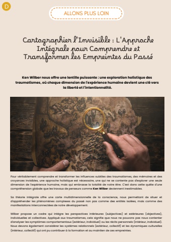 ALLONS PLUS LOINDKen Wilber nous offre une lentille puissante : une exploration holistique destraumatismes, o%u00f9 chaque dimension de l'exp%u00e9rience humaine devient une cl%u00e9 versla libert%u00e9 et l'intentionnalit%u00e9.Cartographier l'Invisible : L'ApprocheInt%u00e9grale pour Comprendre etTransformer les Empreintes du Pass%u00e9Pour v%u00e9ritablement comprendre et transformer les influences subtiles des traumatismes, des m%u00e9moires et descroyances invisibles, une approche holistique est n%u00e9cessaire, une qui ne se contente pas d'explorer une seuledimension de l'exp%u00e9rience humaine, mais qui embrasse la totalit%u00e9 de notre %u00eatre. C'est dans cette qu%u00eate d'unecompr%u00e9hension globale que les travaux de penseurs comme Ken Wilber deviennent inestimables.Sa th%u00e9orie int%u00e9grale offre une carte multidimensionnelle de la conscience, nous permettant de situer etd'appr%u00e9hender les ph%u00e9nom%u00e8nes complexes du pass%u00e9 non pas comme des entit%u00e9s isol%u00e9es, mais comme desmanifestations interconnect%u00e9es de notre d%u00e9veloppement.Wilber propose un cadre qui int%u00e8gre les perspectives int%u00e9rieures (subjectives) et ext%u00e9rieures (objectives),individuelles et collectives. Appliqu%u00e9 aux traumatismes, cela signifie que nous ne pouvons pas nous contenterd'analyser les sympt%u00f4mes comportementaux (ext%u00e9rieur, individuel) ou les r%u00e9cits personnels (int%u00e9rieur, individuel).Nous devons %u00e9galement consid%u00e9rer les syst%u00e8mes relationnels (ext%u00e9rieur, collectif) et les dynamiques culturelles(int%u00e9rieur, collectif) qui ont pu contribuer %u00e0 la formation et au maintien de ces empreintes.