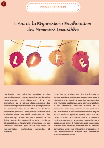 EL'Art de la R%u00e9gression : Explorationdes M%u00e9moires InvisiblesPAROLE D%u2019EXPERTPAROLE D%u2019EXPERTL'exploration des m%u00e9moires invisibles et destraumatismes non r%u00e9solus constitue un domaineth%u00e9rapeutique particuli%u00e8rement riche etprometteur qui a permis d'accompagner descentaines de personnes dans leur qu%u00eate profondede compr%u00e9hension et de lib%u00e9ration de leursempreintes pass%u00e9es. Cette pratique clinique ditespirituelle r%u00e9v%u00e8le une v%u00e9rit%u00e9 fondamentale : lesm%u00e9moires qui influencent les individus ne selimitent pas toujours %u00e0 leur biographie conscienteet accessible, et l'exploration minutieuse de cesterritoires invisibles peut ouvrir des voies detransformation inattendues, profondes etdurables.L'une des approches les plus fascinantes etinnovantes dans ce domaine est sans conteste lar%u00e9gression th%u00e9rapeutique vers des vies pass%u00e9es,une m%u00e9thode sophistiqu%u00e9e qui permet d'acc%u00e9der%u00e0 des m%u00e9moires stock%u00e9es au-del%u00e0 de laconscience ordinaire, dans les strates profondesde l'inconscient. Contrairement aux id%u00e9es re%u00e7ueset aux craintes l%u00e9gitimes qu'elle peut susciter,cette pratique ne consiste pas %u00e0 %u00ab revivre %u00bbdouloureusement et de mani%u00e8re traumatisante lepass%u00e9, mais plut%u00f4t %u00e0 l'observer avec la sagesse,le recul et la maturit%u00e9 %u00e9motionnelle du pr%u00e9sent,permettant ainsi une int%u00e9gration progressive etune transformation durable des empreintes%u00e9motionnelles enfouies.
