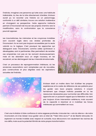 Les traumatismes, les m%u00e9moires et les croyances invisiblessont souvent log%u00e9s dans ces strates profondes del'inconscient. Ils ne sont pas toujours accessibles par la seulevolont%u00e9 ou la logique. C'est pourquoi les approches quidialoguent avec l'inconscient, comme celles qu'Erickson ad%u00e9velopp%u00e9es, sont si pertinentes. Elles permettent de revisiterces empreintes non pas en les revivant douloureusement,mais en les abordant sous un angle nouveau, en lesrecadrant, en les d%u00e9chargeant de leur intensit%u00e9 %u00e9motionnelle.C%u2019est un processus de reprogrammation int%u00e9rieure, o%u00f9 lesanciennes associations sont remplac%u00e9es par de nouvelles,plus constructives et plus align%u00e9es avec les aspirationsactuelles de l'individu.C'est une invitation %u00e0 faire confiance %u00e0 notre sagesse profonde, %u00e0 %u00e9couter les %u00ab voix du silence %u00bb de notreinconscient, et %u00e0 les laisser nous guider vers un %u00e9tat de **bien-%u00eatre accru** et de libert%u00e9 retrouv%u00e9e. Enexplorant ce monde invisible avec respect et curiosit%u00e9, nous d%u00e9couvrons non seulement les racines denos d%u00e9fis, mais aussi le potentiel illimit%u00e9 de notre propre transformation.l'individu. Imaginez une personne qui lutte avec une habitudeind%u00e9sirable. Au lieu de lui dire directement d'arr%u00eater, Ericksonaurait pu lui raconter une histoire o%u00f9 un personnage,confront%u00e9 %u00e0 un d%u00e9fi similaire, trouve une solution inattendueen changeant sa perspective. Cette approche indirectepermet %u00e0 l'inconscient de trouver ses propres chemins vers lamodification, sans la confrontation que la consciencepourrait opposer.Erickson %u00e9tait un ma%u00eetre dans l'art d'utiliser les propresexp%u00e9riences et le cadre de r%u00e9f%u00e9rence de ses patients pourles guider vers leurs propres solutions. Il croyaitfermement que chaque individu poss%u00e8de en lui lesressources n%u00e9cessaires pour surmonter ses difficult%u00e9s. Sonapproche est un puissant rappel que la lib%u00e9ration ne vientpas toujours d'une intervention ext%u00e9rieure, mais souventde la capacit%u00e9 %u00e0 r%u00e9activer et %u00e0 mobiliser les forcesint%u00e9rieures qui sommeillent en nous.