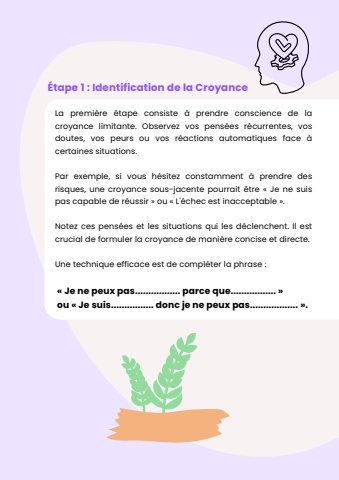%u00c9tape 1 : Identification de la CroyanceLa premi%u00e8re %u00e9tape consiste %u00e0 prendre conscience de lacroyance limitante. Observez vos pens%u00e9es r%u00e9currentes, vosdoutes, vos peurs ou vos r%u00e9actions automatiques face %u00e0certaines situations.Par exemple, si vous h%u00e9sitez constamment %u00e0 prendre desrisques, une croyance sous-jacente pourrait %u00eatre %u00ab Je ne suispas capable de r%u00e9ussir %u00bb ou %u00ab L'%u00e9chec est inacceptable %u00bb.Notez ces pens%u00e9es et les situations qui les d%u00e9clenchent. Il estcrucial de formuler la croyance de mani%u00e8re concise et directe.Une technique efficace est de compl%u00e9ter la phrase :%u00ab Je ne peux pas................. parce que................. %u00bbou %u00ab Je suis................ donc je ne peux pas.................. %u00bb.