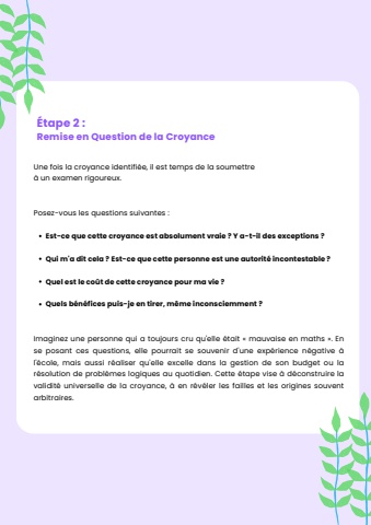 %u00c9tape 2 :Remise en Question de la CroyanceUne fois la croyance identifi%u00e9e, il est temps de la soumettre%u00e0 un examen rigoureux.Posez-vous les questions suivantes :Est-ce que cette croyance est absolument vraie ? Y a-t-il des exceptions ?Qui m'a dit cela ? Est-ce que cette personne est une autorit%u00e9 incontestable ?Quel est le co%u00fbt de cette croyance pour ma vie ?Quels b%u00e9n%u00e9fices puis-je en tirer, m%u00eame inconsciemment ?Imaginez une personne qui a toujours cru qu'elle %u00e9tait %u00ab mauvaise en maths %u00bb. Ense posant ces questions, elle pourrait se souvenir d'une exp%u00e9rience n%u00e9gative %u00e0l'%u00e9cole, mais aussi r%u00e9aliser qu'elle excelle dans la gestion de son budget ou lar%u00e9solution de probl%u00e8mes logiques au quotidien. Cette %u00e9tape vise %u00e0 d%u00e9construire lavalidit%u00e9 universelle de la croyance, %u00e0 en r%u00e9v%u00e9ler les failles et les origines souventarbitraires.