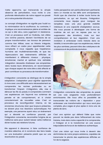 Le concept d'int%u00e9gration ne signifie pas l'oubli oula minimisation de la souffrance. Au contraire, ilimplique une reconnaissance pleine et enti%u00e8re dece qui a %u00e9t%u00e9 v%u00e9cu, sans jugement ni r%u00e9sistance.C'est un processus actif o%u00f9 l'individu, loin d'%u00eatreune victime passive, devient l'architecte de sapropre transformation. Les travaux de penseurscomme Ken Wilber, avec sa th%u00e9orie int%u00e9grale,nous offrent un cadre pour appr%u00e9hender cettecomplexit%u00e9. Il nous rappelle que l'exp%u00e9riencehumaine est multidimensionnelle, et que lesr%u00e9percussions des %u00e9v%u00e9nements difficiles semanifestent %u00e0 diff%u00e9rents niveaux : physique,%u00e9motionnel, mental et spirituel. Une v%u00e9ritableint%u00e9gration n%u00e9cessite d'adresser ces empreintesdans toutes leurs dimensions, en reconnaissantque chaque aspect de notre %u00eatre a %u00e9t%u00e9 affect%u00e9 etpeut contribuer au processus de transformation.Cette perspective est particuli%u00e8rement pertinentedans un monde o%u00f9 les d%u00e9fis sont omnipr%u00e9sents.Plut%u00f4t que de chercher %u00e0 %u00e9viter toute forme deperturbation, ce qui est illusoire, l'int%u00e9grationconsciente nous %u00e9quipe pour naviguer lestemp%u00eates avec une plus grande stabilit%u00e9int%u00e9rieure et une capacit%u00e9 d'adaptation accrue.Elle nous pousse %u00e0 d%u00e9velopper une forme dema%u00eetrise de soi qui ne repose pas sur lasuppression des %u00e9motions, mais sur leurcompr%u00e9hension et leur r%u00e9gulation. C'est uneinvitation %u00e0 embrasser notre histoire dans satotalit%u00e9, %u00e0 reconna%u00eetre que nos exp%u00e9riences, m%u00eameles plus sombres, peuvent %u00eatre des catalyseurs decroissance et de profonde %u00e9volution.Cette approche, qui transcende la simpleabsence de perturbation, nous invite %u00e0 uneprofonde r%u00e9%u00e9valuation de notre rapport au pass%u00e9et %u00e0 notre potentiel d'%u00e9volution.L'int%u00e9gration consciente se distingue de la simpleadaptation. L'adaptation peut signifier apprendre%u00e0 vivre avec une difficult%u00e9 sans n%u00e9cessairement encomprendre les racines profondes ou entransformer l'impact. L'int%u00e9gration, elle, vise %u00e0d%u00e9nouer les fils du pass%u00e9, %u00e0 comprendre commentces exp%u00e9riences ont fa%u00e7onn%u00e9 nos sch%u00e9mas depens%u00e9e et de comportement, et %u00e0 choisirconsciemment de nouvelles voies. C'est unprocessus de reconfiguration interne, o%u00f9 lesanciennes structures, bien que toujours pr%u00e9sentes,ne dictent plus nos r%u00e9actions automatiques. Parexemple, une personne ayant v%u00e9cu un %u00e9v%u00e9nementqui a %u00e9branl%u00e9 sa confiance pourrait, parl'int%u00e9gration consciente, reconna%u00eetre l'origine de sam%u00e9fiance sans pour autant laisser cette m%u00e9fiancedicter toutes ses relations futures.Elle apprend %u00e0 discerner, %u00e0 faire confiance demani%u00e8re s%u00e9lective, et %u00e0 construire des liens bas%u00e9ssur une %u00e9valuation pr%u00e9sente plut%u00f4t que sur uner%u00e9activation du pass%u00e9.L'int%u00e9gration consciente des empreintes du pass%u00e9est une voie exigeante mais profond%u00e9mentenrichissante. Elle nous offre la possibilit%u00e9 detranscender les notions de %u00ab r%u00e9paration %u00bb pourembrasser une transformation qui nous rend pluscomplets, plus sages et plus aptes %u00e0 vivre une viepleine de sens.C'est une opinion qui d%u00e9fend l'id%u00e9e que notrepouvoir ne r%u00e9side pas dans l'effacement de notrehistoire, mais dans notre capacit%u00e9 %u00e0 la comprendre,%u00e0 l'int%u00e9grer et %u00e0 la transformer en une sourcein%u00e9puisable de force et de r%u00e9silience authentique.C'est une vision qui nous invite %u00e0 devenir desalchimistes de notre propre existence, capables detransmuter le plomb des exp%u00e9riences difficiles enl'or de la sagesse.