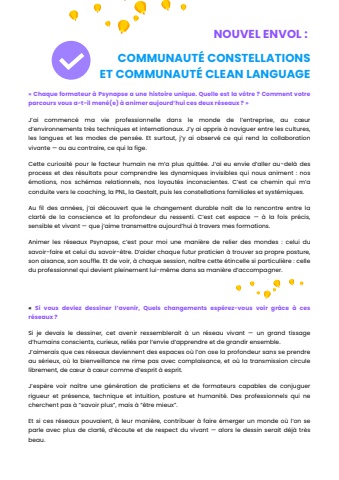 COMMUNAUT%u00c9 CONSTELLATIONSET COMMUNAUT%u00c9 CLEAN LANGUAGEmy-eworld.fr/groupes%u00ab Chaque formateur %u00e0 Psynapse a une histoire unique. Quelle est la v%u00f4tre ? Comment votreparcours vous a-t-il men%u00e9(e) %u00e0 animer aujourd%u2019hui ces deux r%u00e9seaux ? %u00bbJ%u2019ai commenc%u00e9 ma vie professionnelle dans le monde de l%u2019entreprise, au c%u0153urd%u2019environnements tr%u00e8s techniques et internationaux. J%u2019y ai appris %u00e0 naviguer entre les cultures,les langues et les modes de pens%u00e9e. Et surtout, j%u2019y ai observ%u00e9 ce qui rend la collaborationvivante %u2014 ou au contraire, ce qui la fige.Cette curiosit%u00e9 pour le facteur humain ne m%u2019a plus quitt%u00e9e. J%u2019ai eu envie d%u2019aller au-del%u00e0 desprocess et des r%u00e9sultats pour comprendre les dynamiques invisibles qui nous animent : nos%u00e9motions, nos sch%u00e9mas relationnels, nos loyaut%u00e9s inconscientes. C%u2019est ce chemin qui m%u2019aconduite vers le coaching, la PNL, la Gestalt, puis les constellations familiales et syst%u00e9miques.Au fil des ann%u00e9es, j%u2019ai d%u00e9couvert que le changement durable na%u00eet de la rencontre entre laclart%u00e9 de la conscience et la profondeur du ressenti. C%u2019est cet espace %u2014 %u00e0 la fois pr%u00e9cis,sensible et vivant %u2014 que j%u2019aime transmettre aujourd%u2019hui %u00e0 travers mes formations.Animer les r%u00e9seaux Psynapse, c%u2019est pour moi une mani%u00e8re de relier des mondes : celui dusavoir-faire et celui du savoir-%u00eatre. D%u2019aider chaque futur praticien %u00e0 trouver sa propre posture,son aisance, son souffle. Et de voir, %u00e0 chaque session, na%u00eetre cette %u00e9tincelle si particuli%u00e8re : celledu professionnel qui devient pleinement lui-m%u00eame dans sa mani%u00e8re d%u2019accompagner.%u00ab Si vous deviez dessiner l%u2019avenir, Quels changements esp%u00e9rez-vous voir gr%u00e2ce %u00e0 cesr%u00e9seaux ?Si je devais le dessiner, cet avenir ressemblerait %u00e0 un r%u00e9seau vivant %u2014 un grand tissaged%u2019humains conscients, curieux, reli%u00e9s par l%u2019envie d%u2019apprendre et de grandir ensemble.J%u2019aimerais que ces r%u00e9seaux deviennent des espaces o%u00f9 l%u2019on ose la profondeur sans se prendreau s%u00e9rieux, o%u00f9 la bienveillance ne rime pas avec complaisance, et o%u00f9 la transmission circulelibrement, de c%u0153ur %u00e0 c%u0153ur comme d%u2019esprit %u00e0 esprit.J%u2019esp%u00e8re voir na%u00eetre une g%u00e9n%u00e9ration de praticiens et de formateurs capables de conjuguerrigueur et pr%u00e9sence, technique et intuition, posture et humanit%u00e9. Des professionnels qui necherchent pas %u00e0 %u201csavoir plus%u201d, mais %u00e0 %u201c%u00eatre mieux%u201d.Et si ces r%u00e9seaux pouvaient, %u00e0 leur mani%u00e8re, contribuer %u00e0 faire %u00e9merger un monde o%u00f9 l%u2019on separle avec plus de clart%u00e9, d%u2019%u00e9coute et de respect du vivant %u2014 alors le dessin serait d%u00e9j%u00e0 tr%u00e8sbeau.NOUVEL ENVOL :