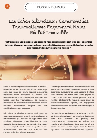DOSSIER EXCLUSIFALes %u00c9chos Silencieux : Comment lesTraumatismes Fa%u00e7onnent NotreR%u00e9alit%u00e9 InvisibleDOSSIER DU MOISVotre anxi%u00e9t%u00e9, vos blocages, vos peurs ne vous appartiennent peut-%u00eatre pas : ce sont les%u00e9chos de blessures pass%u00e9es ou de croyances h%u00e9rit%u00e9es. Alors, comment briser leur emprisepour reprendre le pouvoir sur votre histoire ?Dans le tissu complexe de l'exp%u00e9rience humaine, ilexiste des forces invisibles, des %u00e9chos lointains qui,sans que nous en ayons toujours conscience,fa%u00e7onnent notre perception du monde, nosr%u00e9actions et nos croyances les plus profondes. Cesforces sont les traumatismes, les m%u00e9moiresenfouies et les croyances silencieuses qui, tels descourants sous-marins, dirigent une partsignificative de notre existence.Loin d'%u00eatre de simples souvenirs douloureux, lestraumatismes sont des empreintes %u00e9nerg%u00e9tiques et%u00e9motionnelles qui peuvent se loger dans notresyst%u00e8me, influen%u00e7ant notre bien-%u00eatre et notrecapacit%u00e9 %u00e0 nous %u00e9panouir. Comprendre leur natureet leur impact, c'est ouvrir la porte %u00e0 unetransformation profonde, une lib%u00e9ration descha%u00eenes invisibles qui nous retiennent.Le concept de traumatisme, souvent associ%u00e9 %u00e0 des%u00e9v%u00e9nements extr%u00eames, s'%u00e9tend en r%u00e9alit%u00e9 %u00e0 touteexp%u00e9rience qui submerge notre capacit%u00e9 %u00e0 y faireface, laissant une trace dans notre psych%u00e9 etnotre corps. Ces empreintes peuvent %u00eatre ler%u00e9sultat d'%u00e9v%u00e9nements majeurs, mais aussi demicro-traumatismes r%u00e9p%u00e9t%u00e9s, de n%u00e9gligences%u00e9motionnelles ou de situations o%u00f9 notre int%u00e9grit%u00e9 a%u00e9t%u00e9 compromise.L'impact de ces exp%u00e9riences ne se limite pas %u00e0 lasph%u00e8re psychologique ; il se manifeste %u00e9galementdans nos sch%u00e9mas de pens%u00e9e, noscomportements relationnels et m%u00eame nosr%u00e9actions physiologiques. C'est comme si unepartie de nous restait fig%u00e9e dans le temps,rejouant inconsciemment les sc%u00e9narios du pass%u00e9.