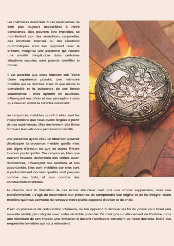 Les m%u00e9moires associ%u00e9es %u00e0 ces exp%u00e9riences nesont pas toujours accessibles %u00e0 notreconscience. Elles peuvent %u00eatre implicites, semanifestant par des sensations corporelles,des %u00e9motions intenses ou des r%u00e9actionsautomatiques sans lien apparent avec lepr%u00e9sent. Imaginez une personne qui ressentune anxi%u00e9t%u00e9 inexplicable dans certainessituations sociales, sans pouvoir identifier lacause.Il est possible que cette r%u00e9action soit l'%u00e9chod'une exp%u00e9rience pass%u00e9e, une m%u00e9moireinvisible qui se r%u00e9active. C'est l%u00e0 que r%u00e9side lacomplexit%u00e9 et la puissance de ces forcessouterraines : elles op%u00e8rent en coulisses,influen%u00e7ant nos choix et nos perceptions sansque nous en ayons le contr%u00f4le conscient.Les croyances invisibles, quant %u00e0 elles, sont lesinterpr%u00e9tations que nous avons forg%u00e9es %u00e0 partirde ces exp%u00e9riences. Elles deviennent des filtres%u00e0 travers lesquels nous percevons la r%u00e9alit%u00e9.Une personne ayant v%u00e9cu un abandon pourraitd%u00e9velopper la croyance invisible qu'elle n'estpas digne d'amour, ou que les autres finironttoujours par la quitter. Ces croyances, bien quesouvent fausses, deviennent des v%u00e9rit%u00e9s autor%u00e9alisatrices, influen%u00e7ant nos relations et nosopportunit%u00e9s. Elles sont invisibles car elles sontsi profond%u00e9ment ancr%u00e9es qu'elles sont per%u00e7uescomme des faits, et non comme desconstructions mentales.Le chemin vers la lib%u00e9ration de ces %u00e9chos silencieux n'est pas une simple suppression, mais unetransformation. Il s'agit de reconna%u00eetre leur pr%u00e9sence, de comprendre leur origine et de les int%u00e9grer d'unemani%u00e8re qui nous permette de retrouver notre pleine capacit%u00e9 d'action et de choix.C'est un processus de restauration int%u00e9rieure, o%u00f9 l'on apprend %u00e0 d%u00e9nouer les fils du pass%u00e9 pour tisser unenouvelle r%u00e9alit%u00e9, plus align%u00e9e avec notre v%u00e9ritable potentiel. Ce n'est pas un effacement de l'histoire, maisune r%u00e9%u00e9criture de son impact, une invitation %u00e0 devenir l'architecte conscient de notre destin%u00e9e, lib%u00e9r%u00e9 desempreintes invisibles qui nous retenaient.