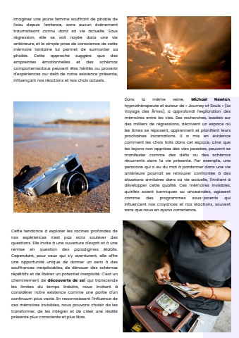 Imaginez une jeune femme souffrant de phobie del'eau depuis l'enfance, sans aucun %u00e9v%u00e9nementtraumatisant connu dans sa vie actuelle. Sousr%u00e9gression, elle se voit noy%u00e9e dans une vieant%u00e9rieure, et la simple prise de conscience de cettem%u00e9moire lointaine lui permet de surmonter saphobie. Cette approche sugg%u00e8re que desempreintes %u00e9motionnelles et des sch%u00e9mascomportementaux peuvent %u00eatre h%u00e9rit%u00e9s ou provenird'exp%u00e9riences au-del%u00e0 de notre existence pr%u00e9sente,influen%u00e7ant nos r%u00e9actions et nos choix actuels.Cette tendance %u00e0 explorer les racines profondes denos exp%u00e9riences n'est pas sans soulever desquestions. Elle invite %u00e0 une ouverture d'esprit et %u00e0 uneremise en question des paradigmes %u00e9tablis.Cependant, pour ceux qui s'y aventurent, elle offreune opportunit%u00e9 unique de donner un sens %u00e0 dessouffrances inexplicables, de d%u00e9nouer des sch%u00e9masr%u00e9p%u00e9titifs et de lib%u00e9rer un potentiel inexploit%u00e9. C'est uncheminement de d%u00e9couverte de soi qui transcendeles limites du temps lin%u00e9aire, nous invitant %u00e0consid%u00e9rer notre existence comme une partie d'uncontinuum plus vaste. En reconnaissant l'influence deces m%u00e9moires invisibles, nous pouvons choisir de lestransformer, de les int%u00e9grer et de cr%u00e9er une r%u00e9alit%u00e9pr%u00e9sente plus consciente et plus libre.Dans la m%u00eame veine, Michael Newton,hypnoth%u00e9rapeute et auteur de %u00ab Journey of Souls %u00bb (LeVoyage des %u00c2mes), a approfondi l'exploration desm%u00e9moires entre les vies. Ses recherches, bas%u00e9es surdes milliers de r%u00e9gressions, d%u00e9crivent un espace o%u00f9les %u00e2mes se reposent, apprennent et planifient leursprochaines incarnations. Il a mis en %u00e9videncecomment les choix faits dans cet espace, ainsi queles le%u00e7ons non apprises des vies pass%u00e9es, peuvent semanifester comme des d%u00e9fis ou des sch%u00e9masr%u00e9currents dans la vie pr%u00e9sente. Par exemple, unepersonne qui a eu du mal %u00e0 pardonner dans une vieant%u00e9rieure pourrait se retrouver confront%u00e9e %u00e0 dessituations similaires dans sa vie actuelle, l'invitant %u00e0d%u00e9velopper cette qualit%u00e9. Ces m%u00e9moires invisibles,qu'elles soient karmiques ou ancestrales, agissentcomme des programmes sous-jacents quiinfluencent nos croyances et nos r%u00e9actions, souventsans que nous en ayons conscience.