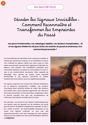 AREFLEXIONEN SAVOIR PLUSVos peurs irrationnelles, vos sabotages r%u00e9p%u00e9t%u00e9s, vos douleurs inexplicables... Etsi ces signaux %u00e9taient la cl%u00e9 pour briser les cha%u00eenes du pass%u00e9 et embrasser uneautonomie personnelle ?D%u00e9coder les Signaux Invisibles :Comment Reconna%u00eetre etTransformer les Empreintesdu Pass%u00e9Les signaux corporels sont souvent les premiers indicateursde la pr%u00e9sence d'empreintes invisibles. Des tensionschroniques dans certaines parties du corps, des douleursr%u00e9currentes sans cause physique apparente, des r%u00e9actionsde sursaut excessives, ou des sensations d'oppression dansla poitrine peuvent tous %u00eatre des manifestations dem%u00e9moires traumatiques stock%u00e9es dans le corps.Par exemple, une personne qui ressent syst%u00e9matiquementune tension dans les %u00e9paules lors de situations de conflitpourrait porter l'empreinte d'exp%u00e9riences pass%u00e9es o%u00f9 elle ad%u00fb %u00ab porter le poids %u00bb de responsabilit%u00e9s excessives ou destress. Ces signaux corporels ne sont pas desdysfonctionnements, mais des messages de notre syst%u00e8meinterne qui nous alertent sur des zones n%u00e9cessitant attentionet int%u00e9gration.Les traumatismes, les m%u00e9moires et les croyances invisibles nerestent pas cach%u00e9s pour toujours. Ils se manifestent %u00e0 traversune multitude de signaux subtils que notre corps et notreesprit nous envoient constamment. Apprendre %u00e0 d%u00e9coder cessignaux, c'est acqu%u00e9rir une comp%u00e9tence pr%u00e9cieuse pourreconna%u00eetre l'influence du pass%u00e9 sur notre pr%u00e9sent et ouvrir lavoie %u00e0 une transformation consciente. Cette capacit%u00e9 ded%u00e9codage nous permet de passer d'une r%u00e9activit%u00e9inconsciente %u00e0 une r%u00e9ponse consciente et choisie,transformant notre relation avec nos exp%u00e9riences pass%u00e9es.