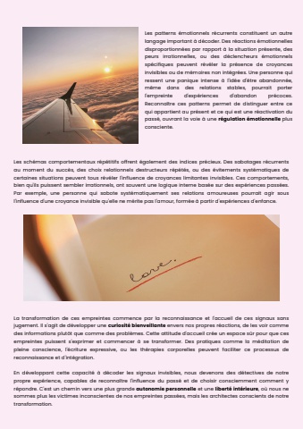 Les sch%u00e9mas comportementaux r%u00e9p%u00e9titifs offrent %u00e9galement des indices pr%u00e9cieux. Des sabotages r%u00e9currentsau moment du succ%u00e8s, des choix relationnels destructeurs r%u00e9p%u00e9t%u00e9s, ou des %u00e9vitements syst%u00e9matiques decertaines situations peuvent tous r%u00e9v%u00e9ler l'influence de croyances limitantes invisibles. Ces comportements,bien qu'ils puissent sembler irrationnels, ont souvent une logique interne bas%u00e9e sur des exp%u00e9riences pass%u00e9es.Par exemple, une personne qui sabote syst%u00e9matiquement ses relations amoureuses pourrait agir sousl'influence d'une croyance invisible qu'elle ne m%u00e9rite pas l'amour, form%u00e9e %u00e0 partir d'exp%u00e9riences d'enfance.Les patterns %u00e9motionnels r%u00e9currents constituent un autrelangage important %u00e0 d%u00e9coder. Des r%u00e9actions %u00e9motionnellesdisproportionn%u00e9es par rapport %u00e0 la situation pr%u00e9sente, despeurs irrationnelles, ou des d%u00e9clencheurs %u00e9motionnelssp%u00e9cifiques peuvent r%u00e9v%u00e9ler la pr%u00e9sence de croyancesinvisibles ou de m%u00e9moires non int%u00e9gr%u00e9es. Une personne quiressent une panique intense %u00e0 l'id%u00e9e d'%u00eatre abandonn%u00e9e,m%u00eame dans des relations stables, pourrait porterl'empreinte d'exp%u00e9riences d'abandon pr%u00e9coces.Reconna%u00eetre ces patterns permet de distinguer entre cequi appartient au pr%u00e9sent et ce qui est une r%u00e9activation dupass%u00e9, ouvrant la voie %u00e0 une r%u00e9gulation %u00e9motionnelle plusconsciente.La transformation de ces empreintes commence par la reconnaissance et l'accueil de ces signaux sansjugement. Il s'agit de d%u00e9velopper une curiosit%u00e9 bienveillante envers nos propres r%u00e9actions, de les voir commedes informations plut%u00f4t que comme des probl%u00e8mes. Cette attitude d'accueil cr%u00e9e un espace s%u00fbr pour que cesempreintes puissent s'exprimer et commencer %u00e0 se transformer. Des pratiques comme la m%u00e9ditation depleine conscience, l'%u00e9criture expressive, ou les th%u00e9rapies corporelles peuvent faciliter ce processus dereconnaissance et d'int%u00e9gration.En d%u00e9veloppant cette capacit%u00e9 %u00e0 d%u00e9coder les signaux invisibles, nous devenons des d%u00e9tectives de notrepropre exp%u00e9rience, capables de reconna%u00eetre l'influence du pass%u00e9 et de choisir consciemment comment yr%u00e9pondre. C'est un chemin vers une plus grande autonomie personnelle et une libert%u00e9 int%u00e9rieure, o%u00f9 nous nesommes plus les victimes inconscientes de nos empreintes pass%u00e9es, mais les architectes conscients de notretransformation.